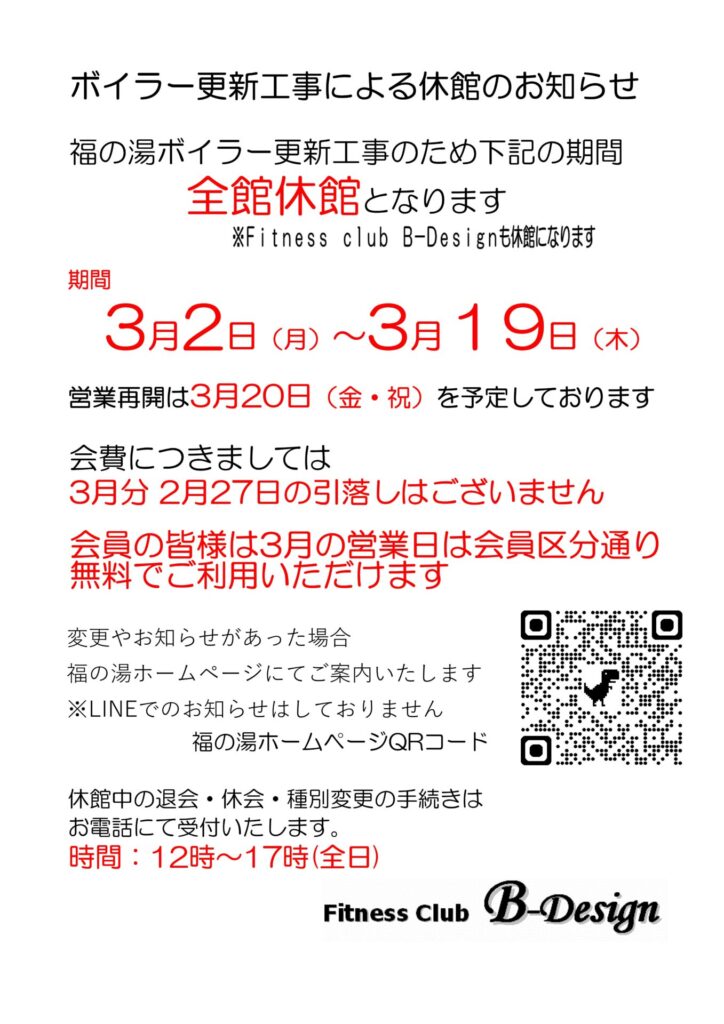 フィットネス ボイラー工事に伴う休館のお知らせ 2/16更新